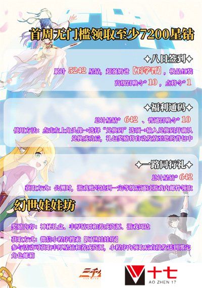1、首日上线即领取166+188+288=642星钻,公测首周一路同行再送188*7=1316星钻,八日签到狂送5242星钻,总计7200星钻。
