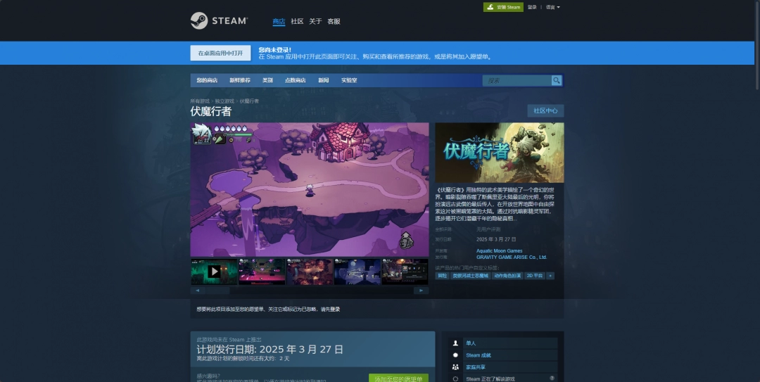 《伏魔行者》是一款结合了开放世界探索的2D 平台动作冒险游戏,而这款游戏的官网地址就是Steam平台的购买页面,进入到这个游戏的购买页面基本上就能知道所有这款游戏的信息。